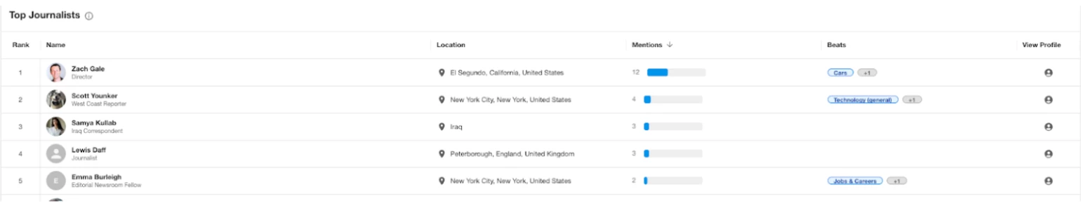 - 导航至顶级记者以查看品牌、产品、人物或地点的汇总提及总数,并查看记者专长的报道领域,以便判断是否值得与他们合作或发送提案。