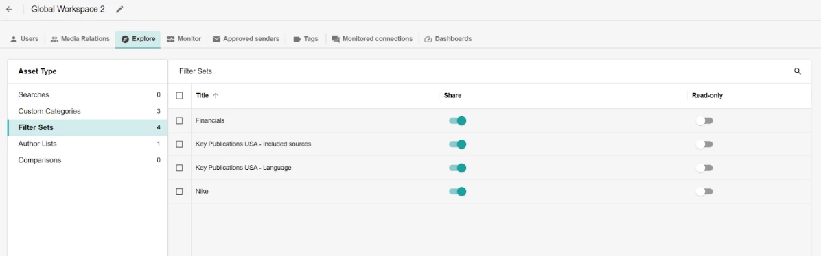 Note:The Explore tab has four asset types to choose from - Searches, Custom Categories, Filter Sets, Author Lists, and Comparisons. These assets can be shared or unshared using the toggle button. Shared assets are available for all users in any Workspace to view, and use. Unshared assets can only be seen and used in the Workspace they were created in.