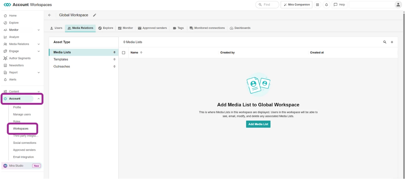 - Media Relations has three assets that can be included in a Workspace: Media Lists, Templates, and Outreaches.