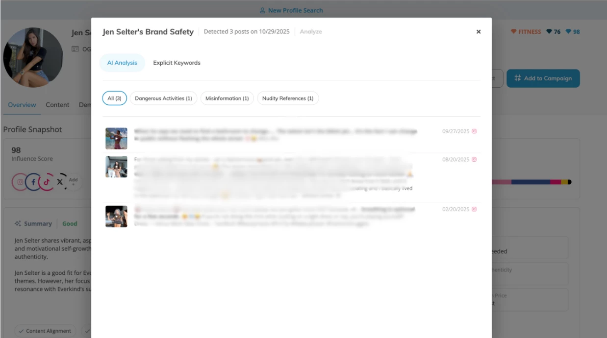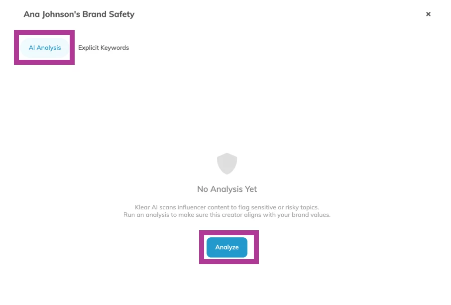 - We’ve upgraded Klear’s Brand Safety feature with advanced AI analysis that understands how influencers talk about topics—not just what they say. This update gives you a clearer, more contextual view of influencer content so you can confidently assess potential risks before starting a partnership. To use the updated Brand Safety feature, follow these steps: