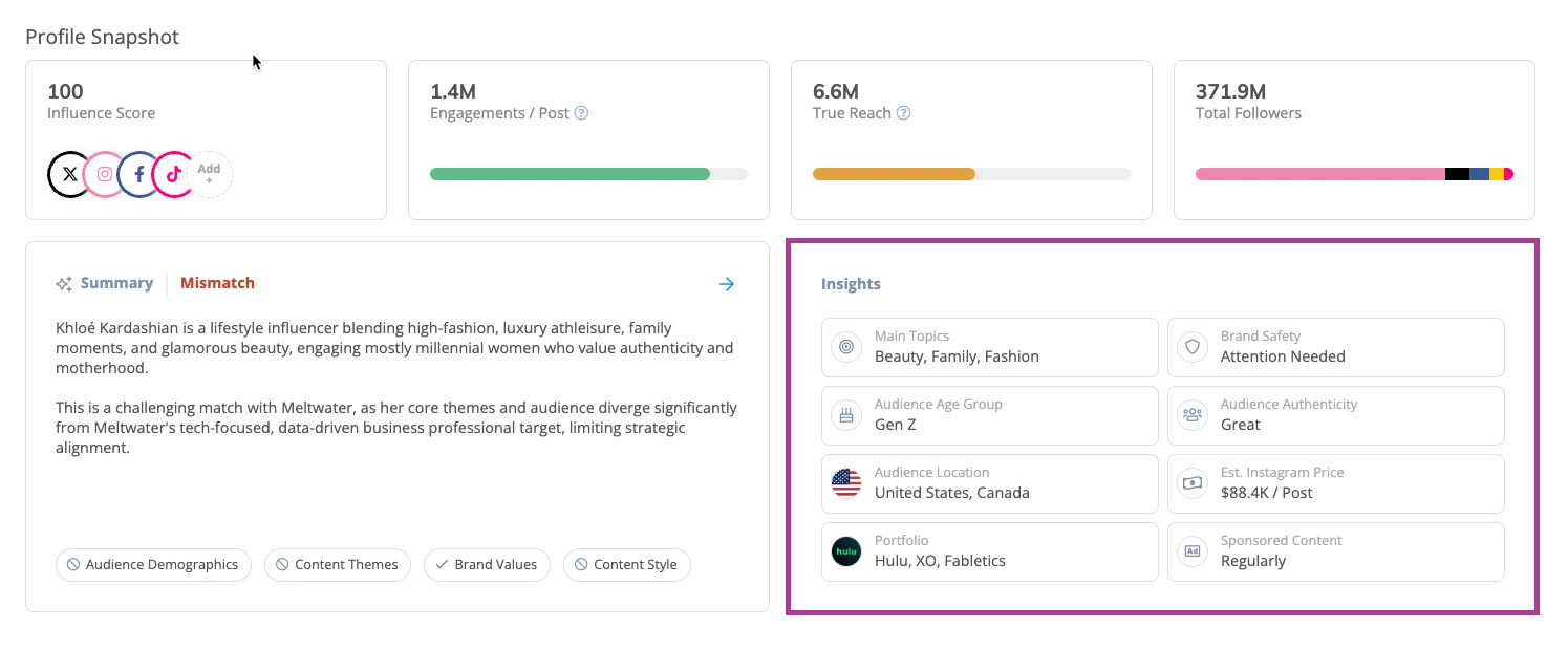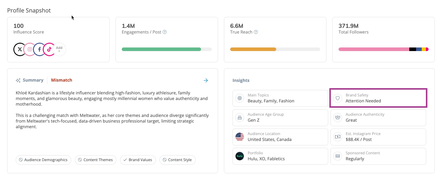 A quick view on content themes, brand safety signals, sponsorship frequency, and audience breakdowns, making it easy to validate relevance and reputation.