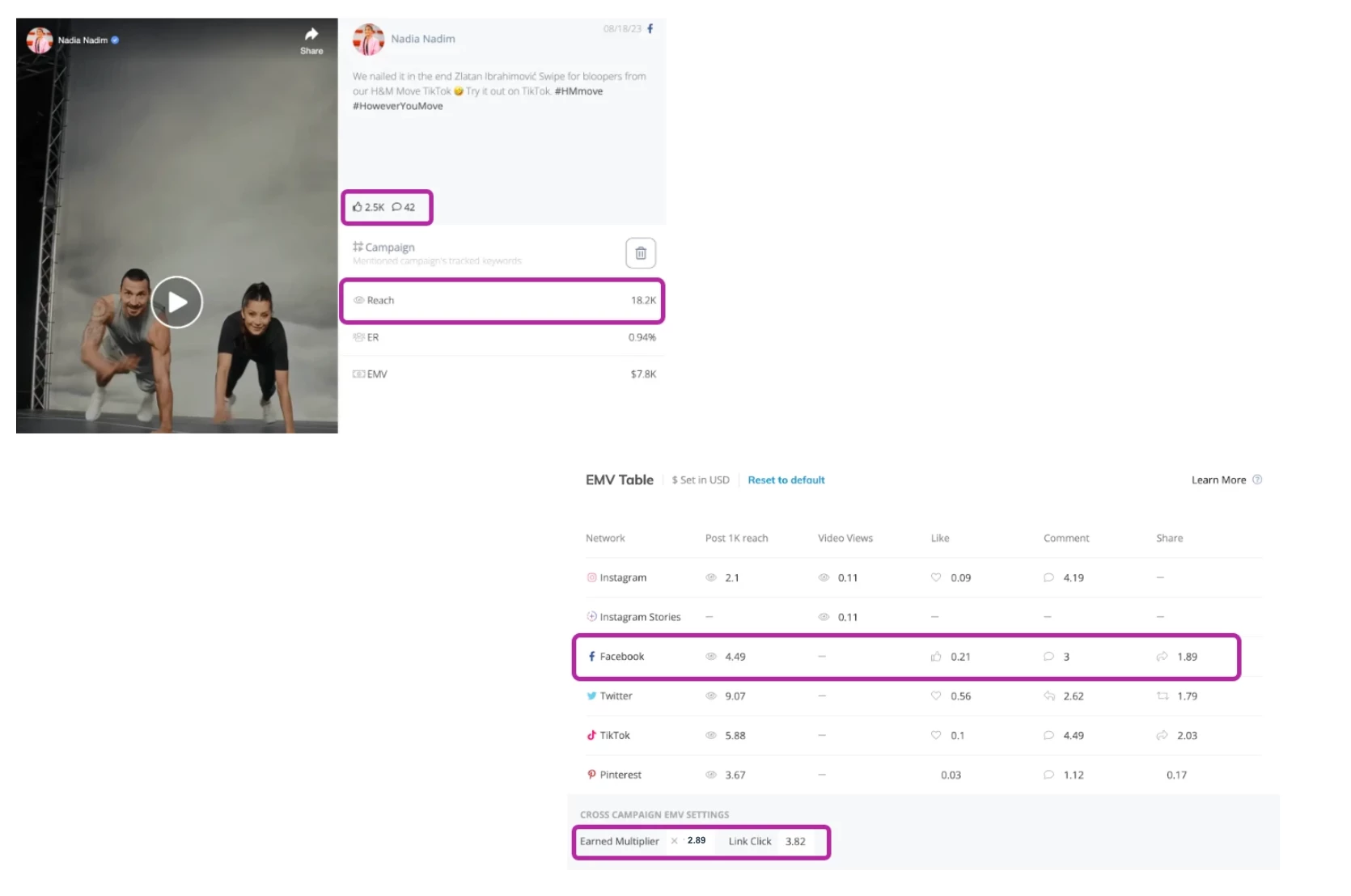 This Facebook post had a reach of 18.2k, 2.5k likes, and 42 comments. Please note that the Reach benchmark is for 1K reach, and therefore, you will need to divide by 1,000. Based on the reach and engagement, we would calculate EMV as follows: