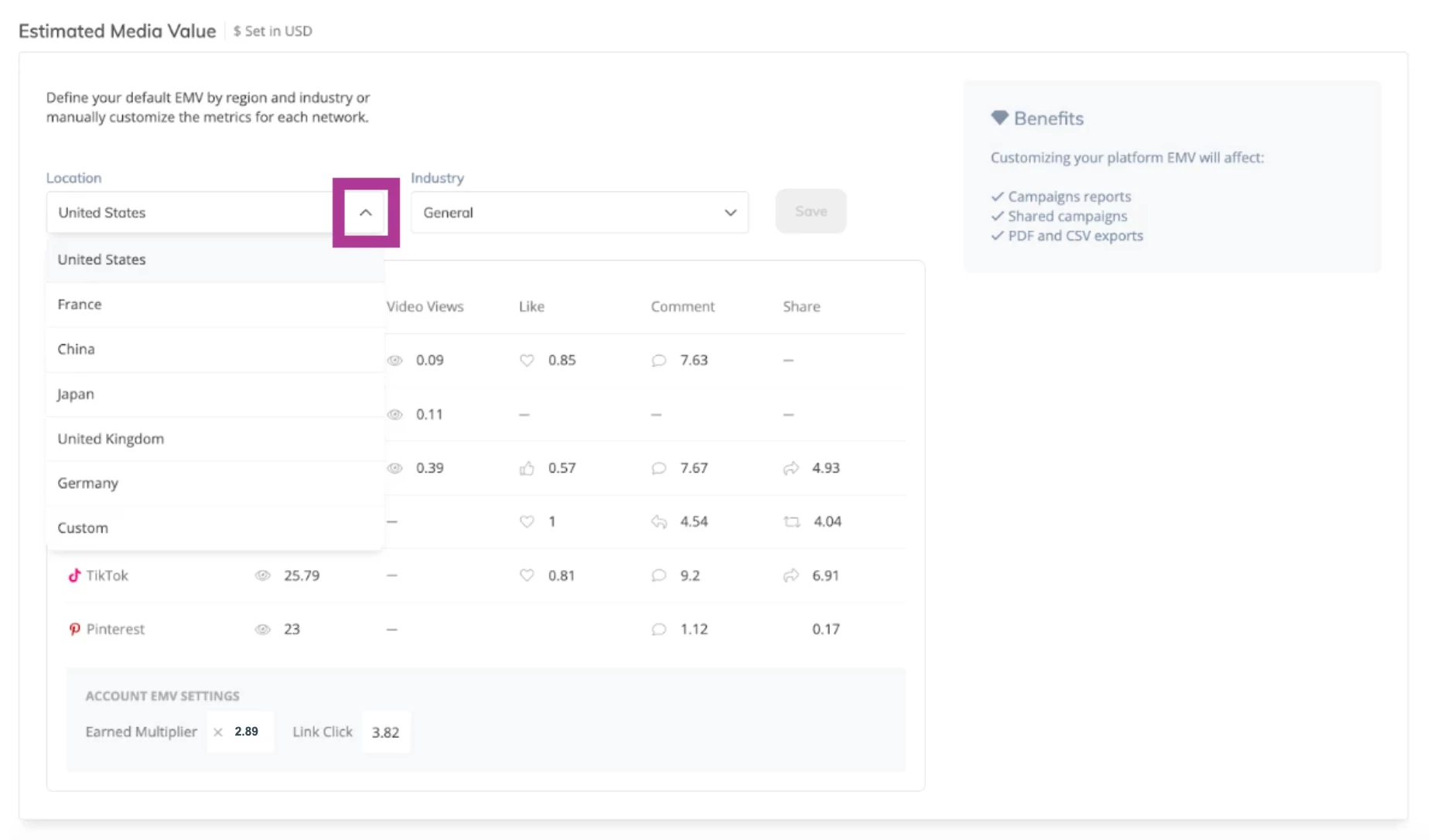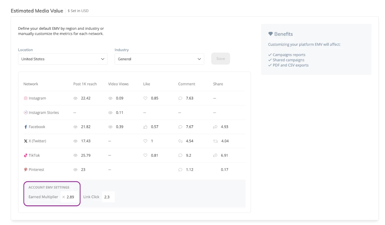 - Benchmarks that represent what each social action (reach, likes, comments, shares) would cost in paid media.