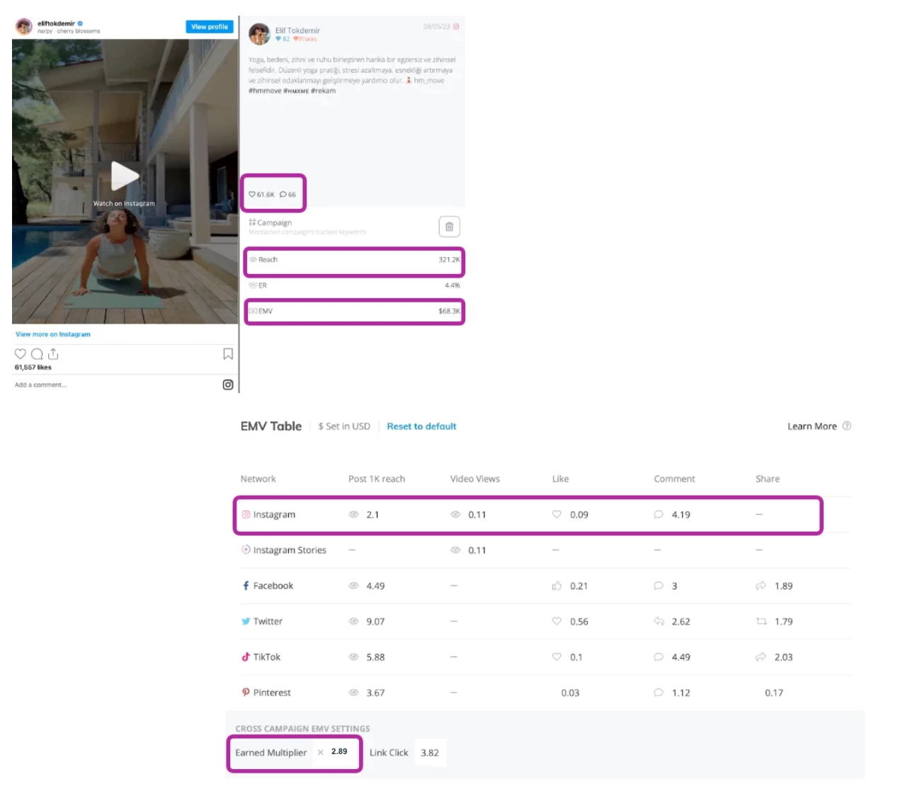 This Instagram post had a reach of 321.2k, 61.6k likes, and 66 comments. Please note that the Reach benchmark is for 1K reach, and therefore, you will need to divide by 1,000. Based on the reach and engagement, we would calculate EMV as follows: