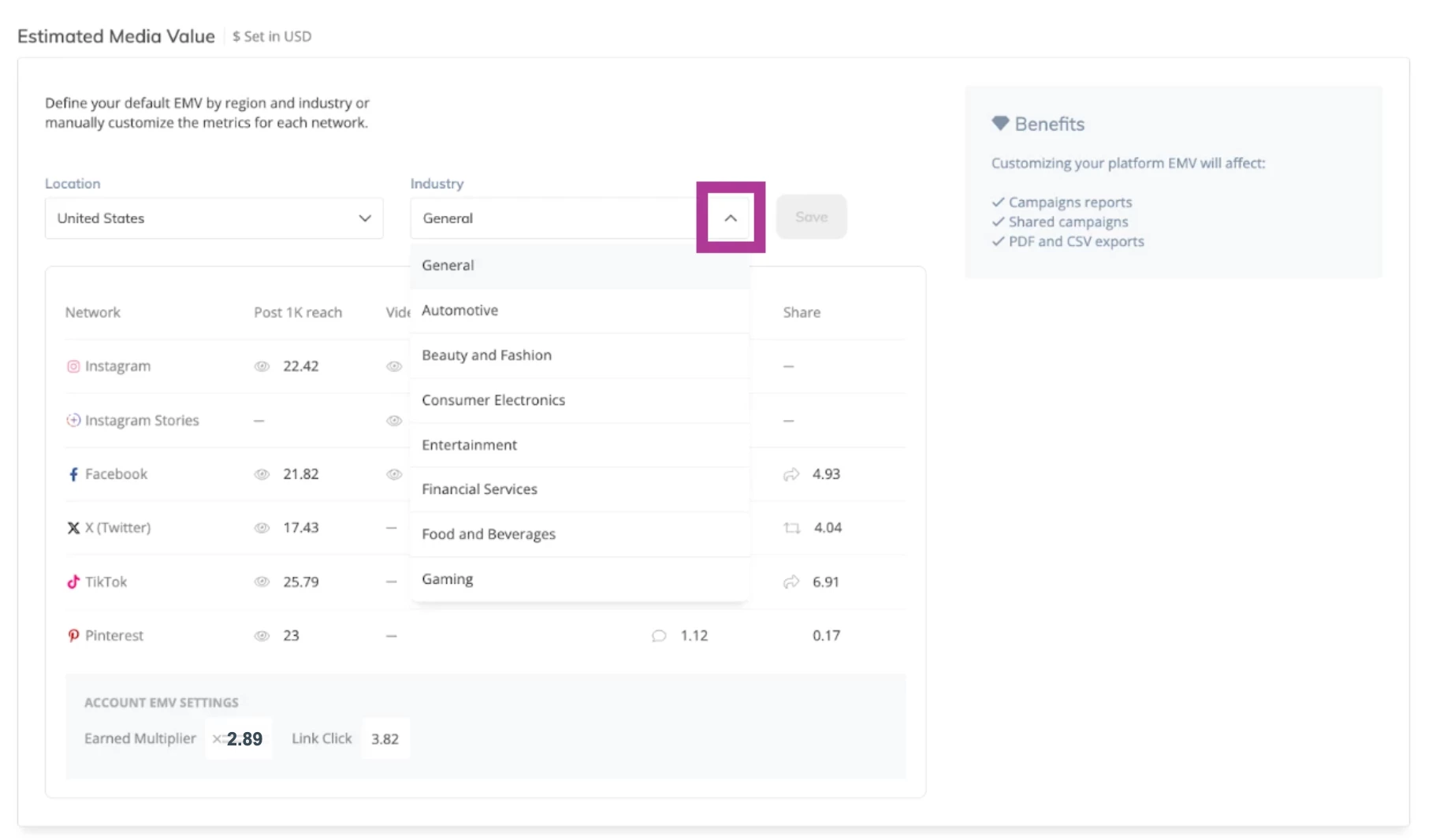 Use the Industry drop-down to select from available categories (e.g., General, Automotive, Beauty, Fashion, etc.). Or select General to apply overarching benchmarks.
