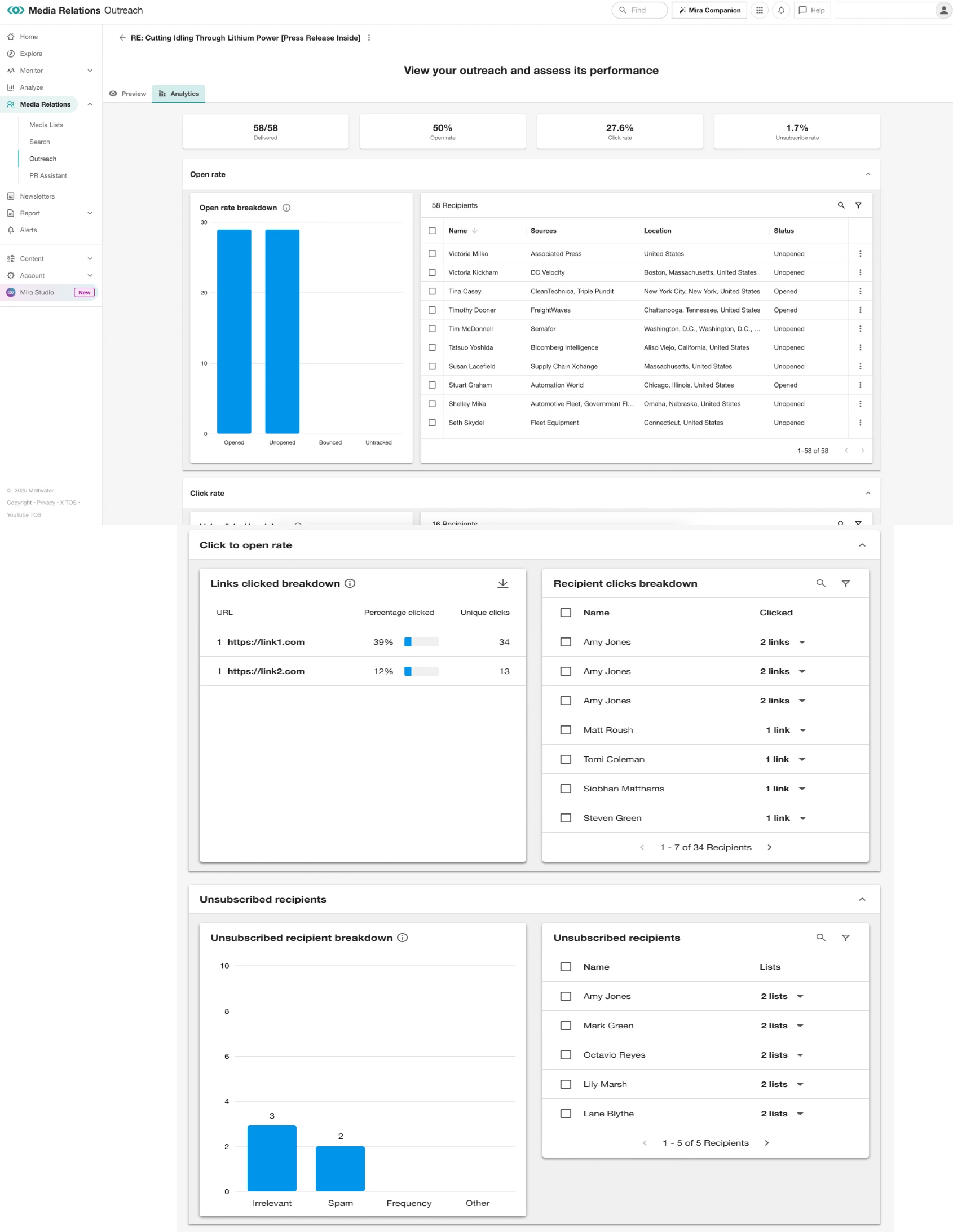 Outreach in Meltwater’s Media Relations platform empowers you to send personalized press releases and pitches directly to journalists, media contacts, or entire media lists. Designed for public relations professionals, Outreach streamlines your communication workflow with tools for drafting, scheduling, and analyzing email engagement. Whether you’re launching a campaign or following up with key contacts, Outreach helps you manage your media relationships at scale—while maintaining personal, targeted communication. From template creation and performance tracking to recipient management and deliverability safeguards, Outreach is your all-in-one hub for executing and optimizing PR outreach efforts.