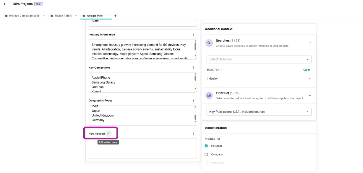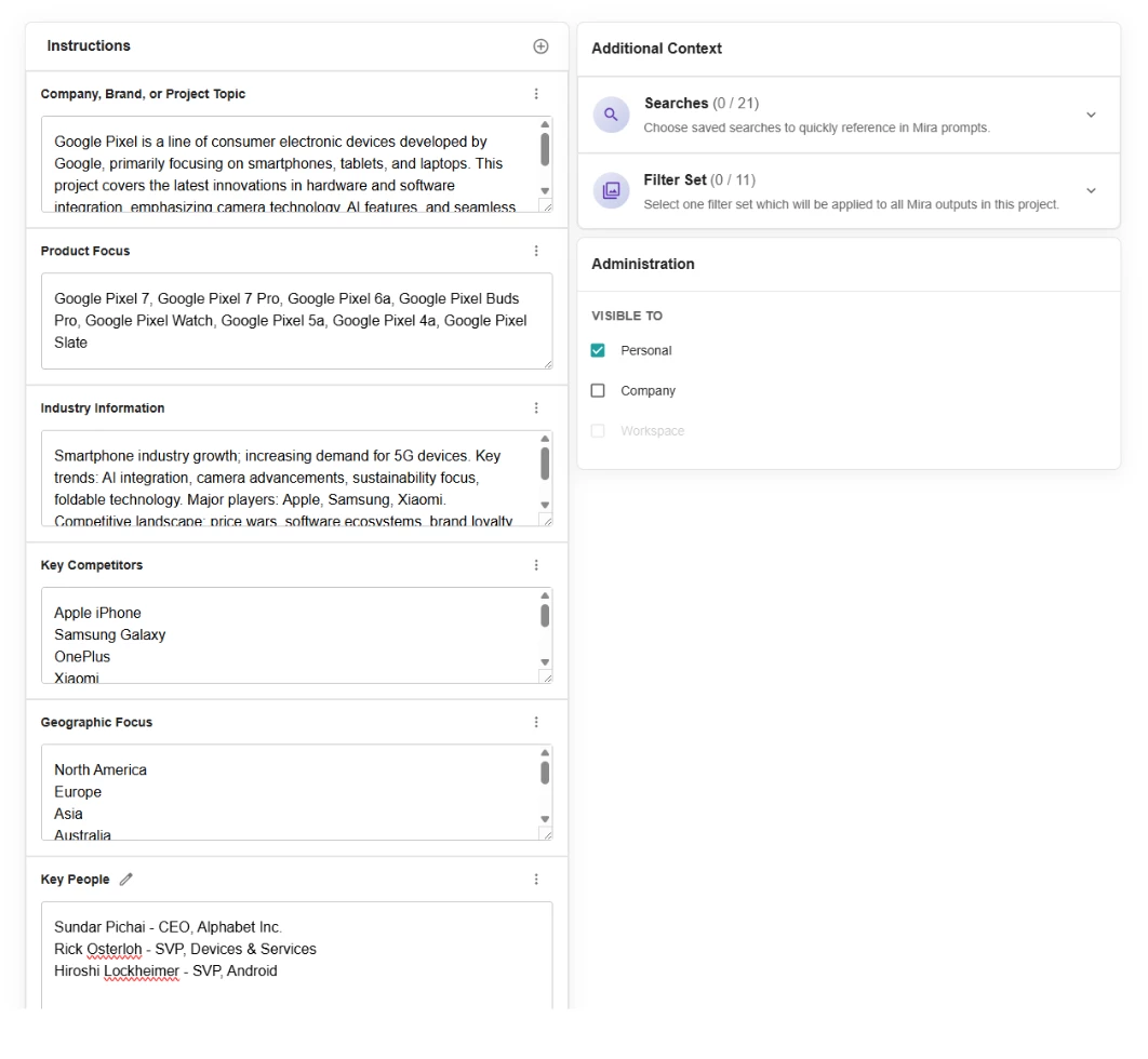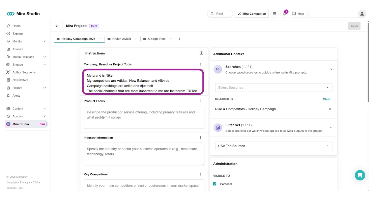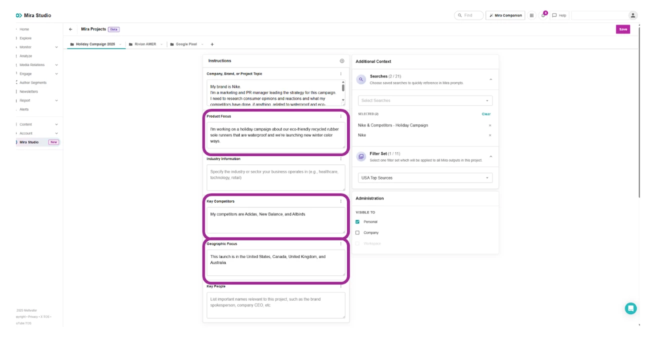 • With Projects, you can save time typing out all the details and write more generic prompts. Depending on your context and instructions, Mira may ask you to clarify your prompt. Here are some prompt examples: