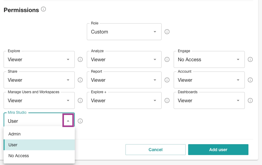 - No Access: Removes Mira Studio from the user's left-navigation menu