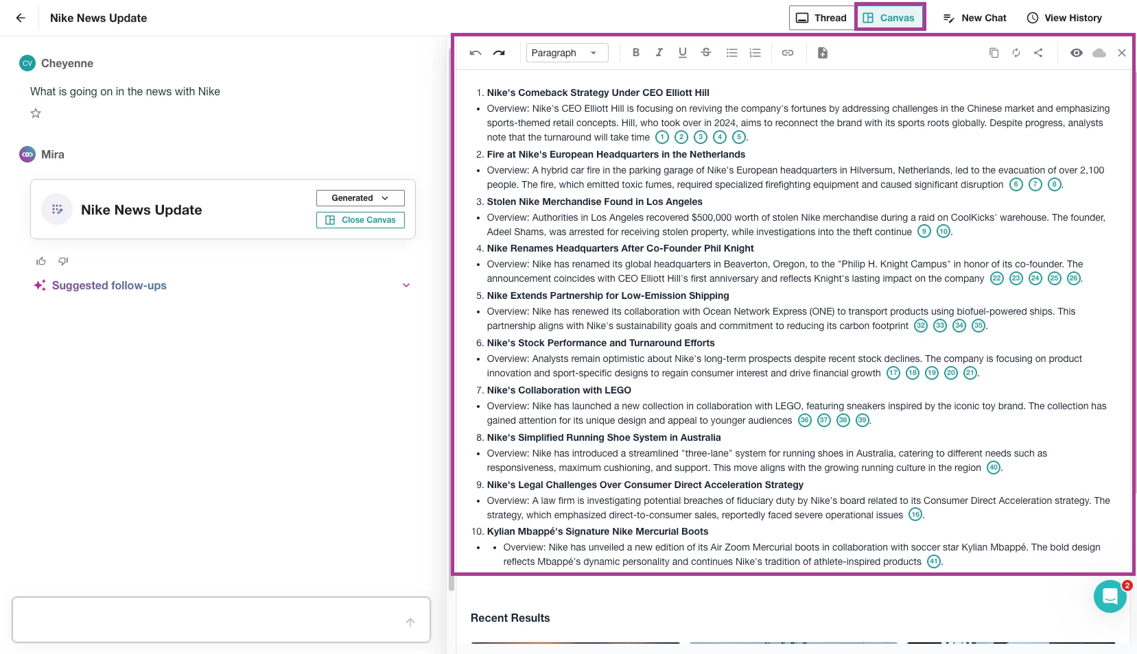 Canvas View is your interactive workspace. It’s where you can build on Mira’s response—adding context, adjusting tone, or including specific links and details that matter to your audience. You’ll also see tools for commenting, editing, and tracking changes.
