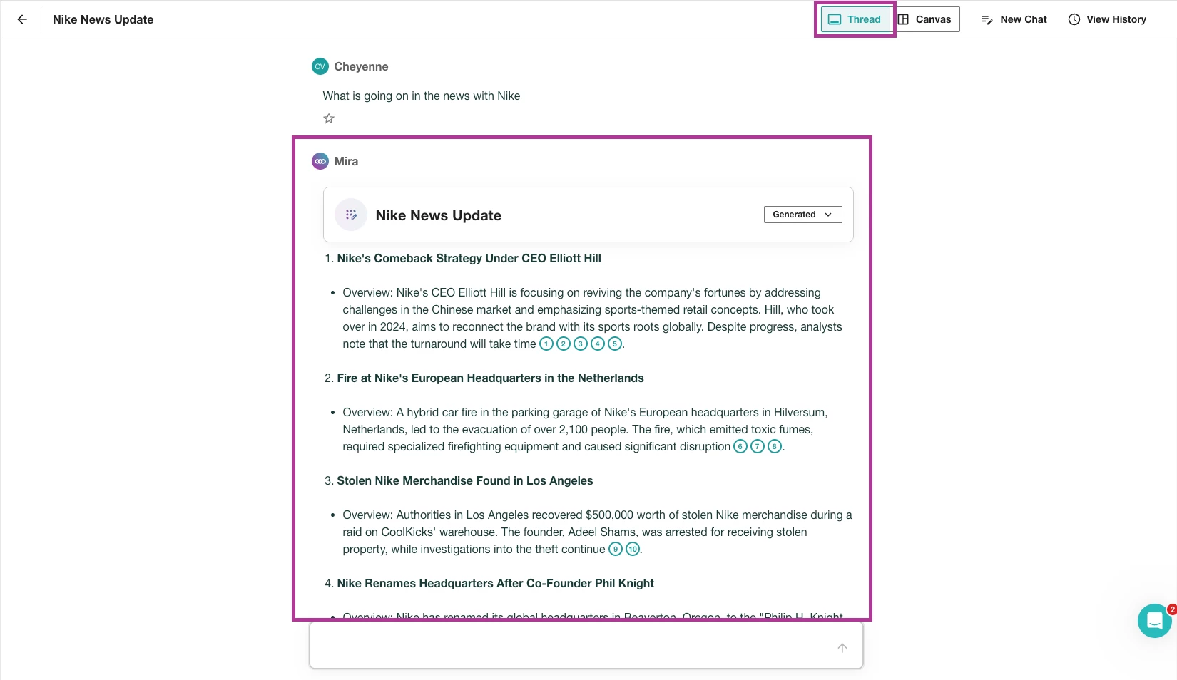 After you ask Mira Studio a question, the AI generates a response based on your prompt. From there, you have two ways to view and interact with the result: Canvas View and Thread View.