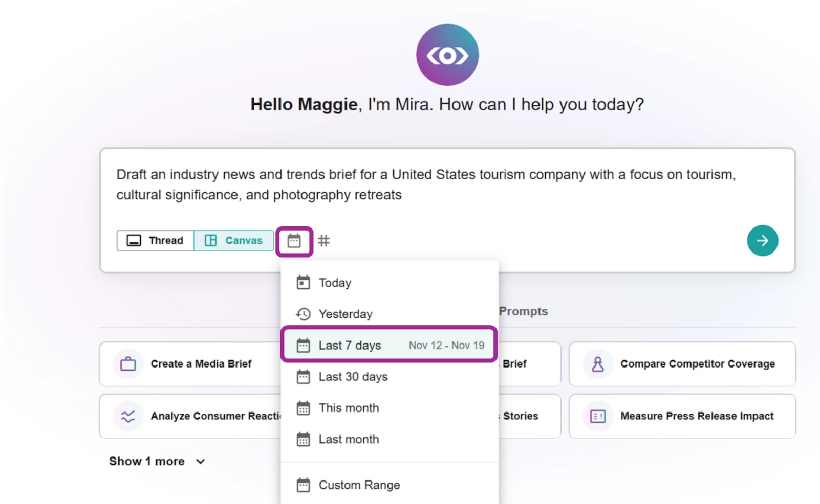 - After submitting, Mira Studio scans Meltwater’s database, news sources, and internal AI-powered indexing to find the most relevant information.