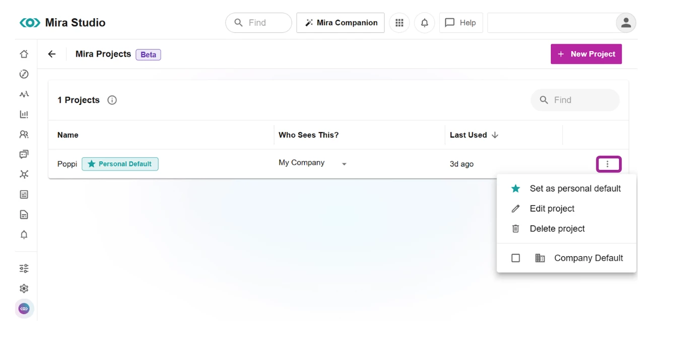 - Définir comme défaut personnel : charge automatiquement ce projet chaque fois que vous ouvrez Mira Studio