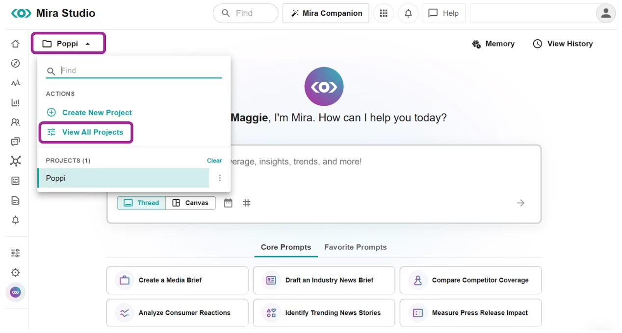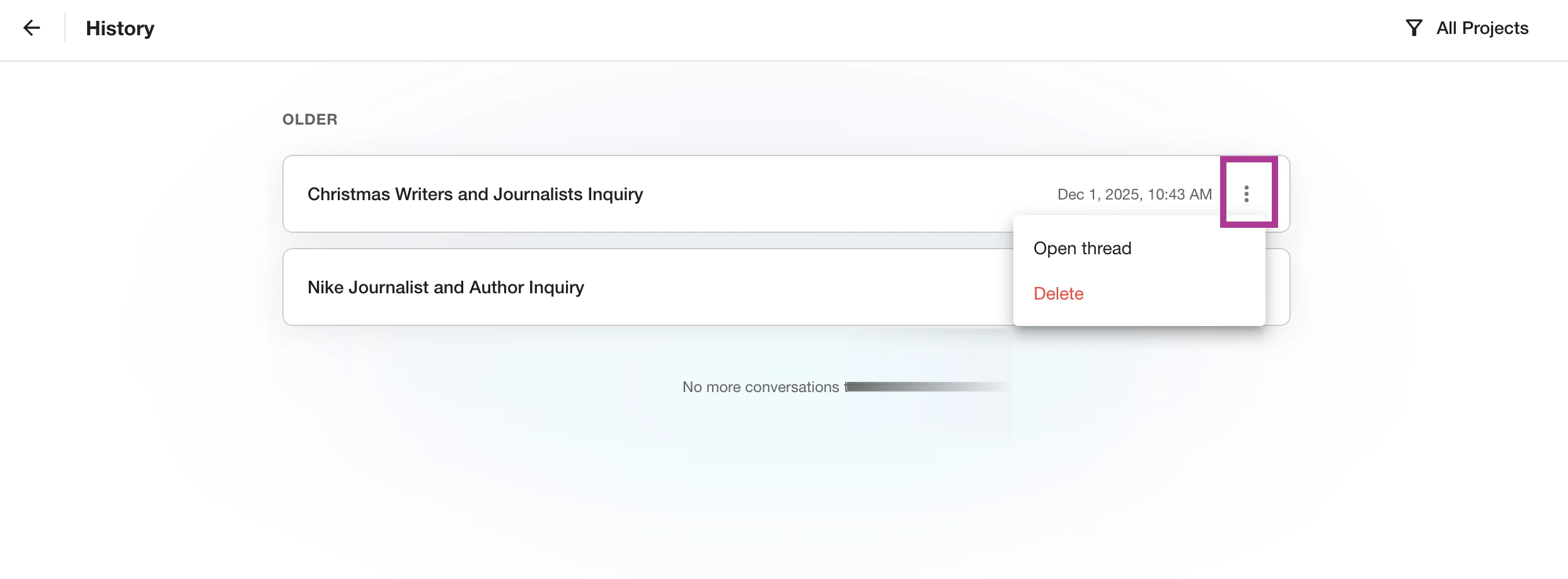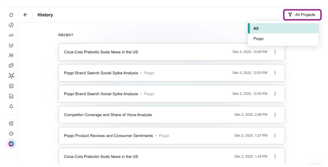 - Pour filtrer l'historique des prompts par projet, cliquez sur Tous les projets en haut à droite