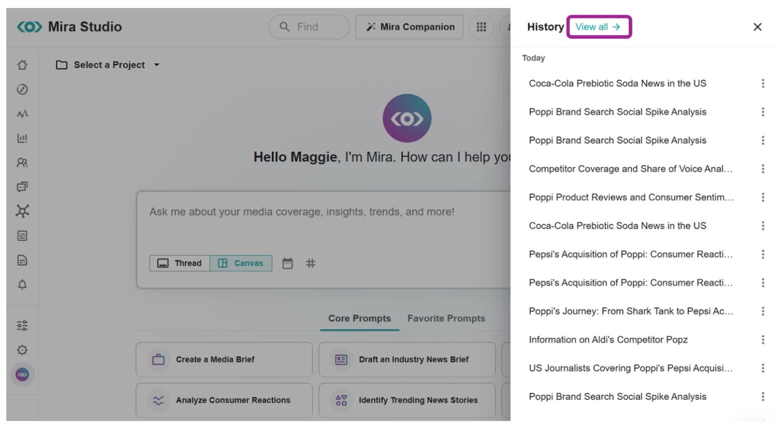 - Sélectionnez le projet pour une liste de prompts historiques spécifiques au projet.