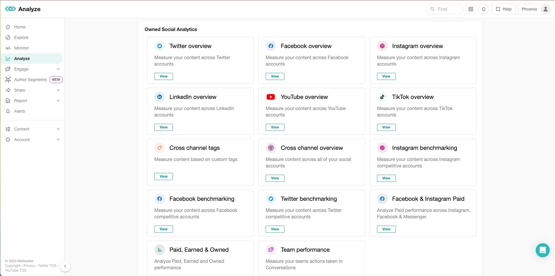 To get started, navigate to the Analyze section and select one of the Owned Social Analytics reports. For this example, I'll use the Cross Channel Overview.