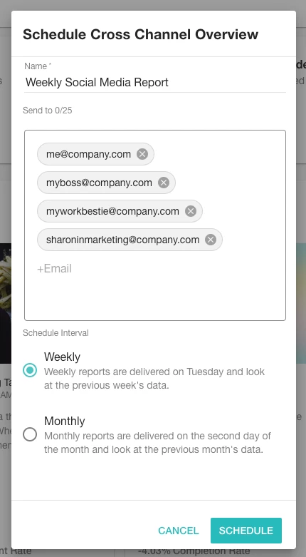 Typically, the person responsible for managing the social media accounts would receive the report on a weekly basis, while stakeholders within your organization would receive the monthly report.