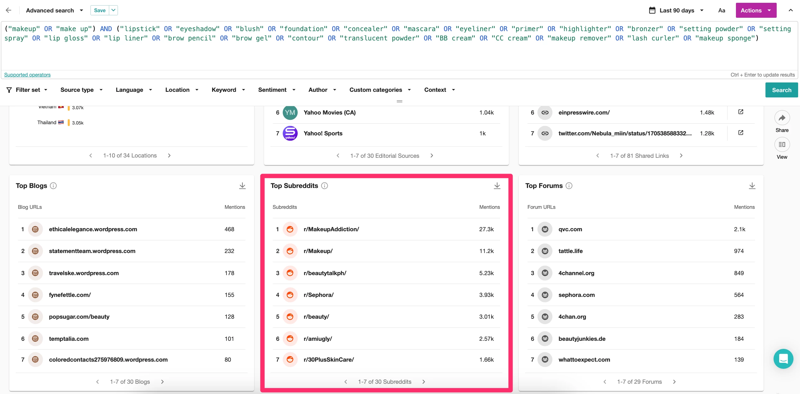 Here, I will find a list of the Subreddits that are mentioning my makeup terms the most, including spaces like r/MakeupAddiction and r/beauty. To create a search for these Subreddits, I simply use the sourceName: operator like this -
