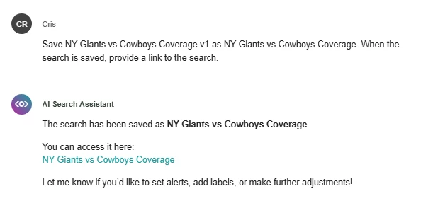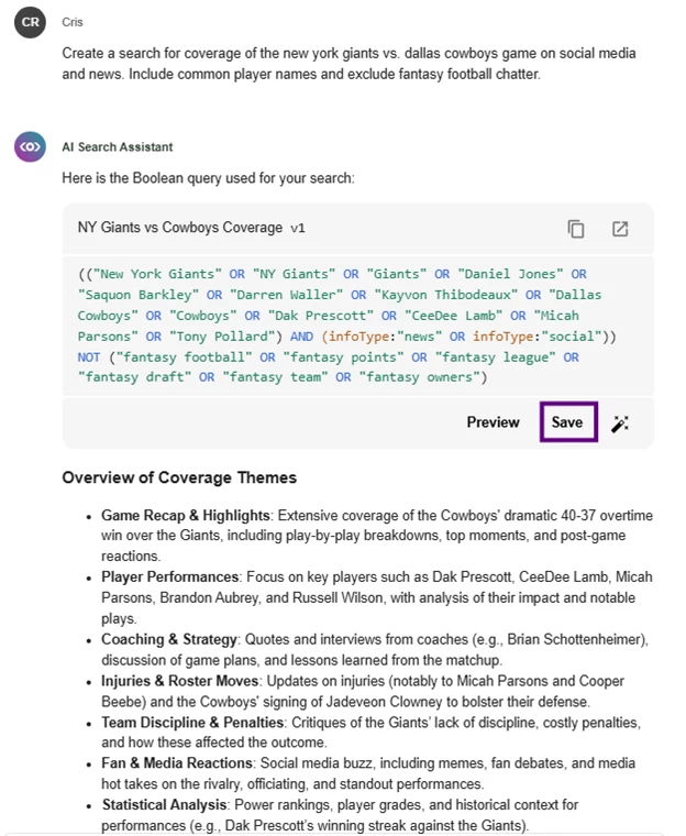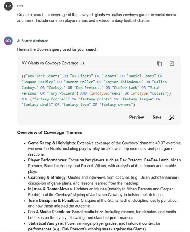 âCreate a search for coverage of the new york giants vs. dallas cowboys game on social media and news. Include common player names and exclude fantasy football chatter.â