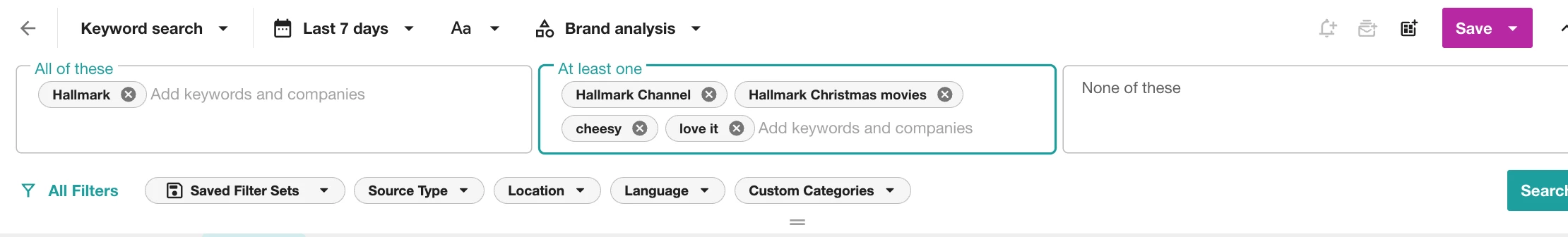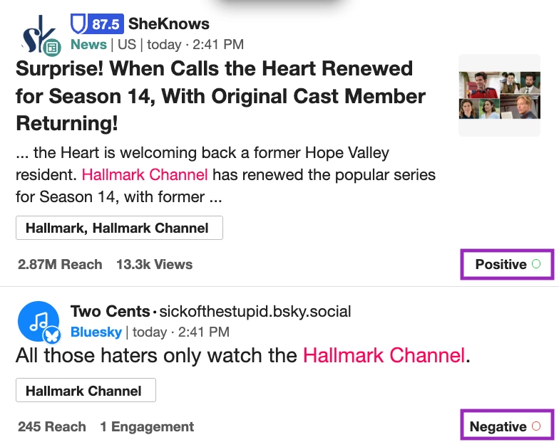 Let’s say you're a media brand like Hallmark, known for your snow-filled movie marathons and emotional plotlines. Before diving into sentiment, start by tracking your most relevant keywords and mentions.