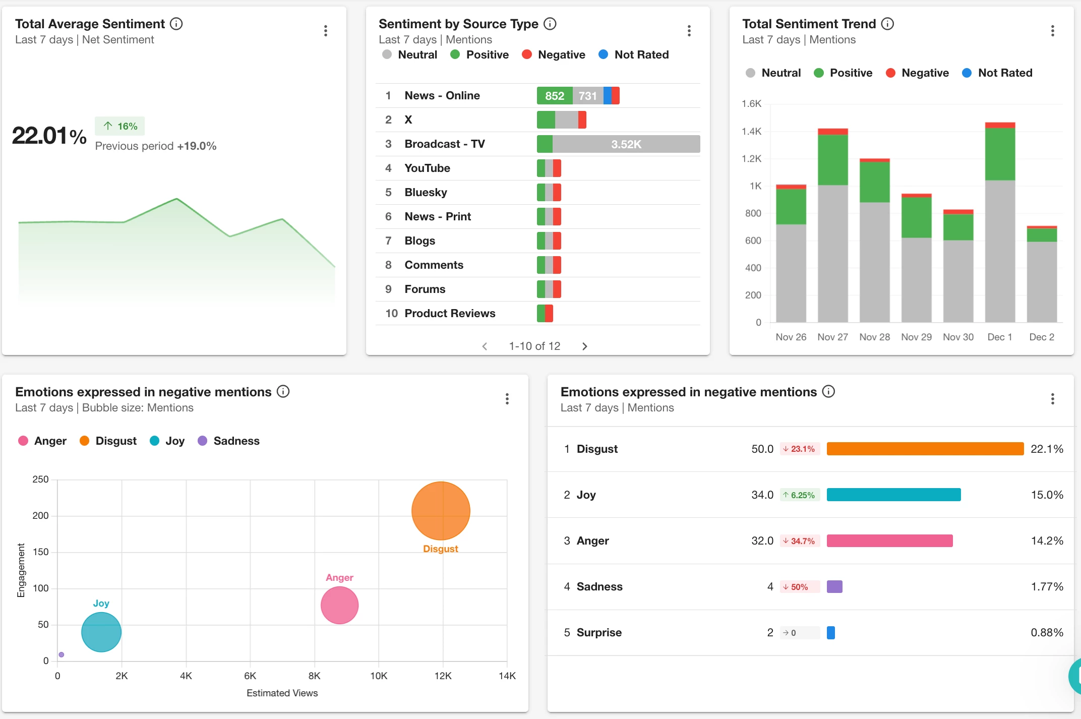 Breaks down the dominant emotions in your mentions (like joy, disgust, anger, etc.).