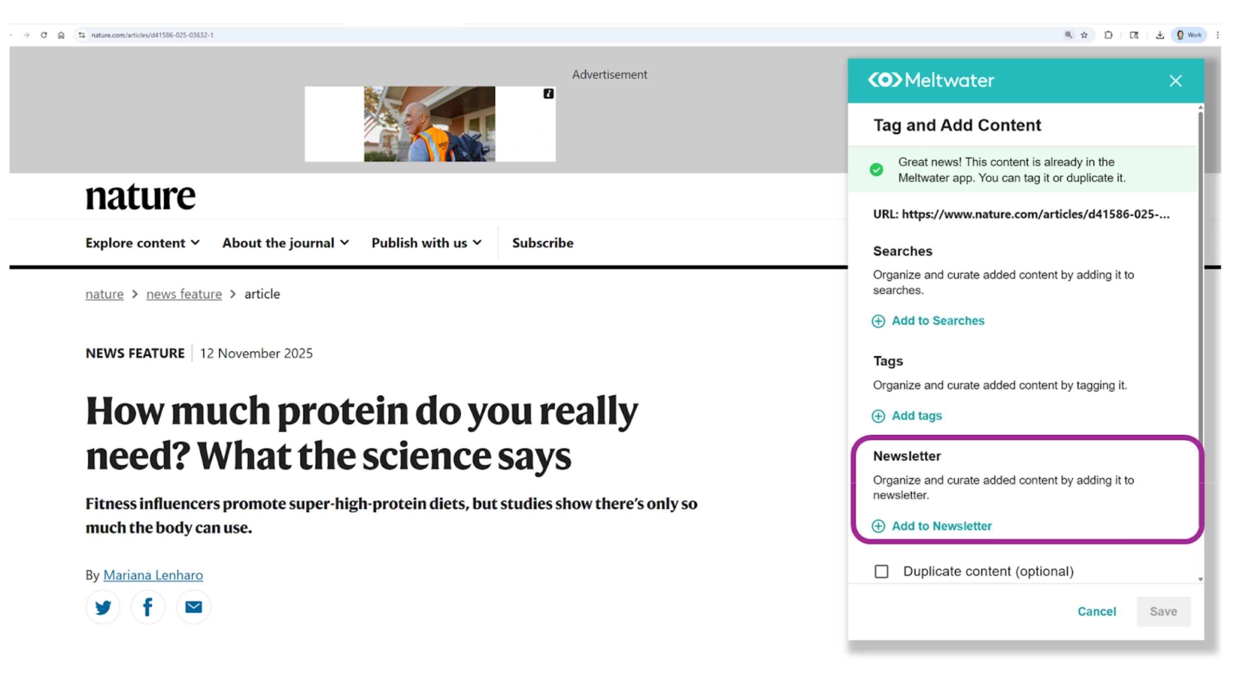 After installing the Meltwater Chrome Extension, follow these steps to add content directly to your Newsletters: