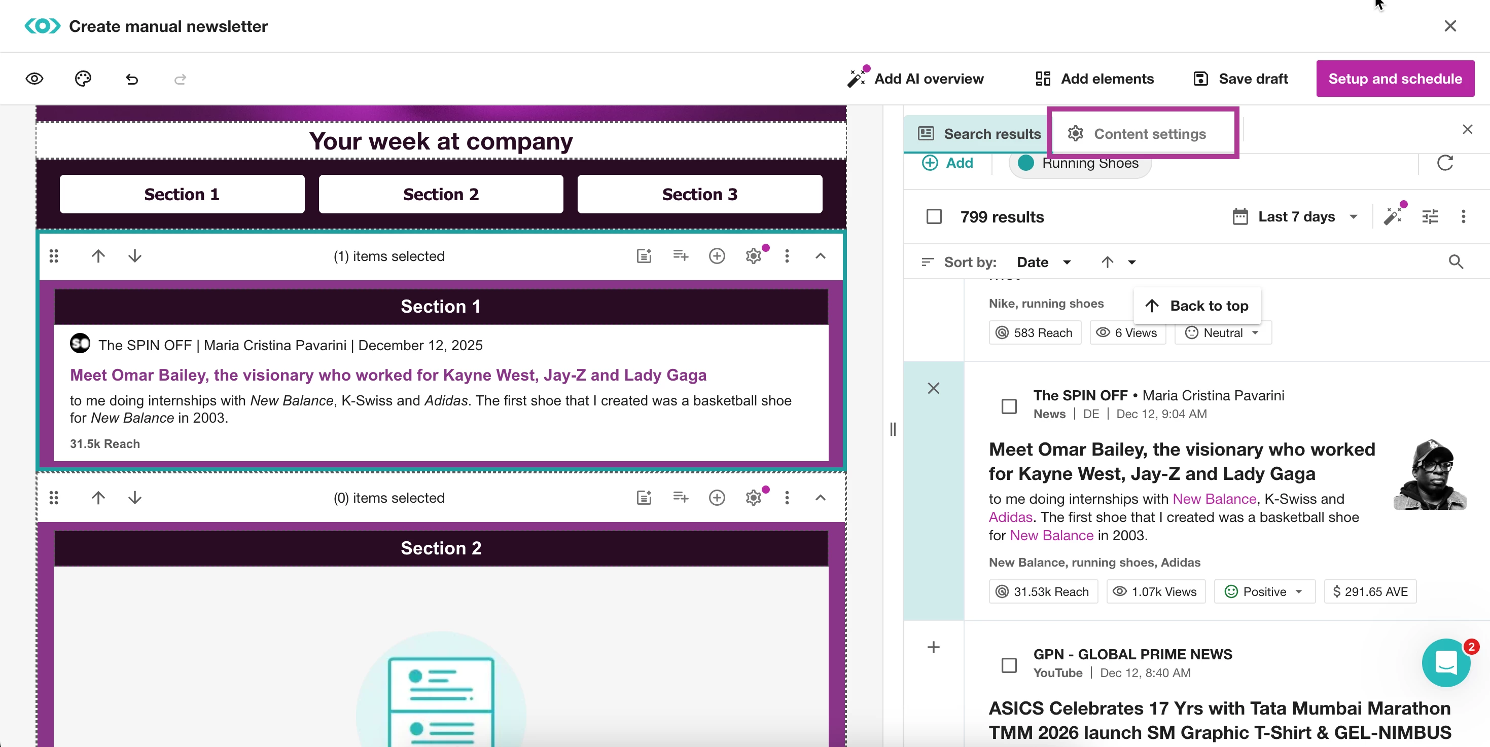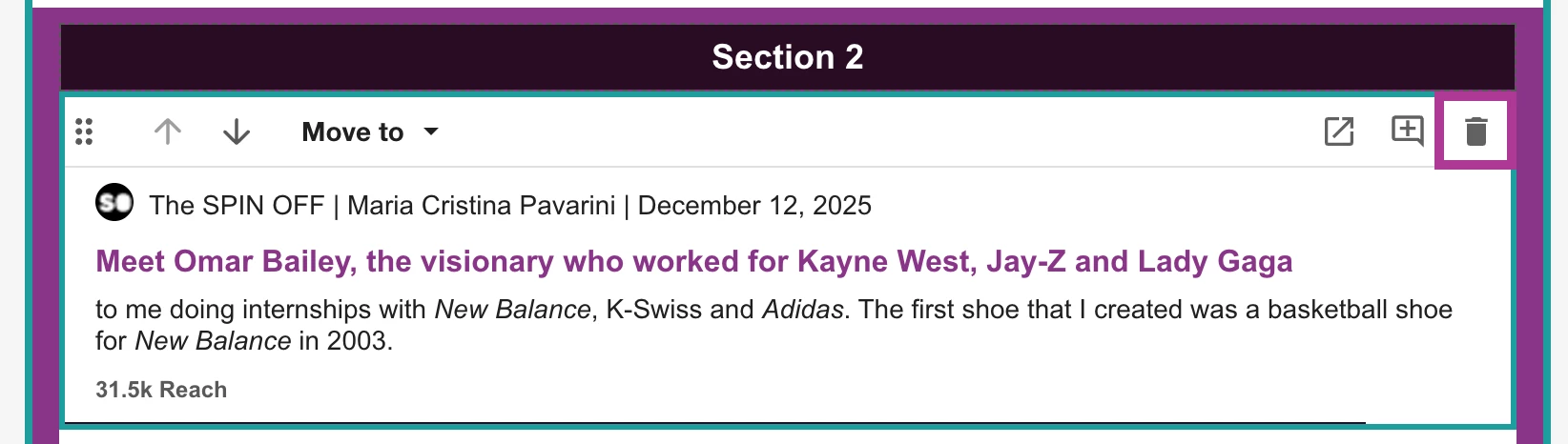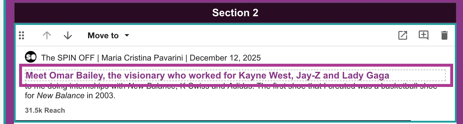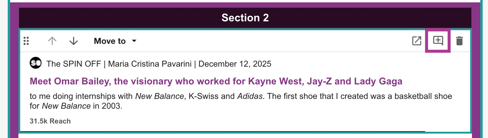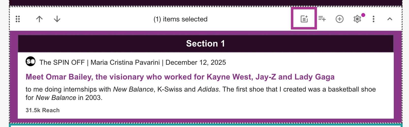 1. Click the + icon to the left of any mention to add it to your newsletter section. It will then immediately appear in the layout.