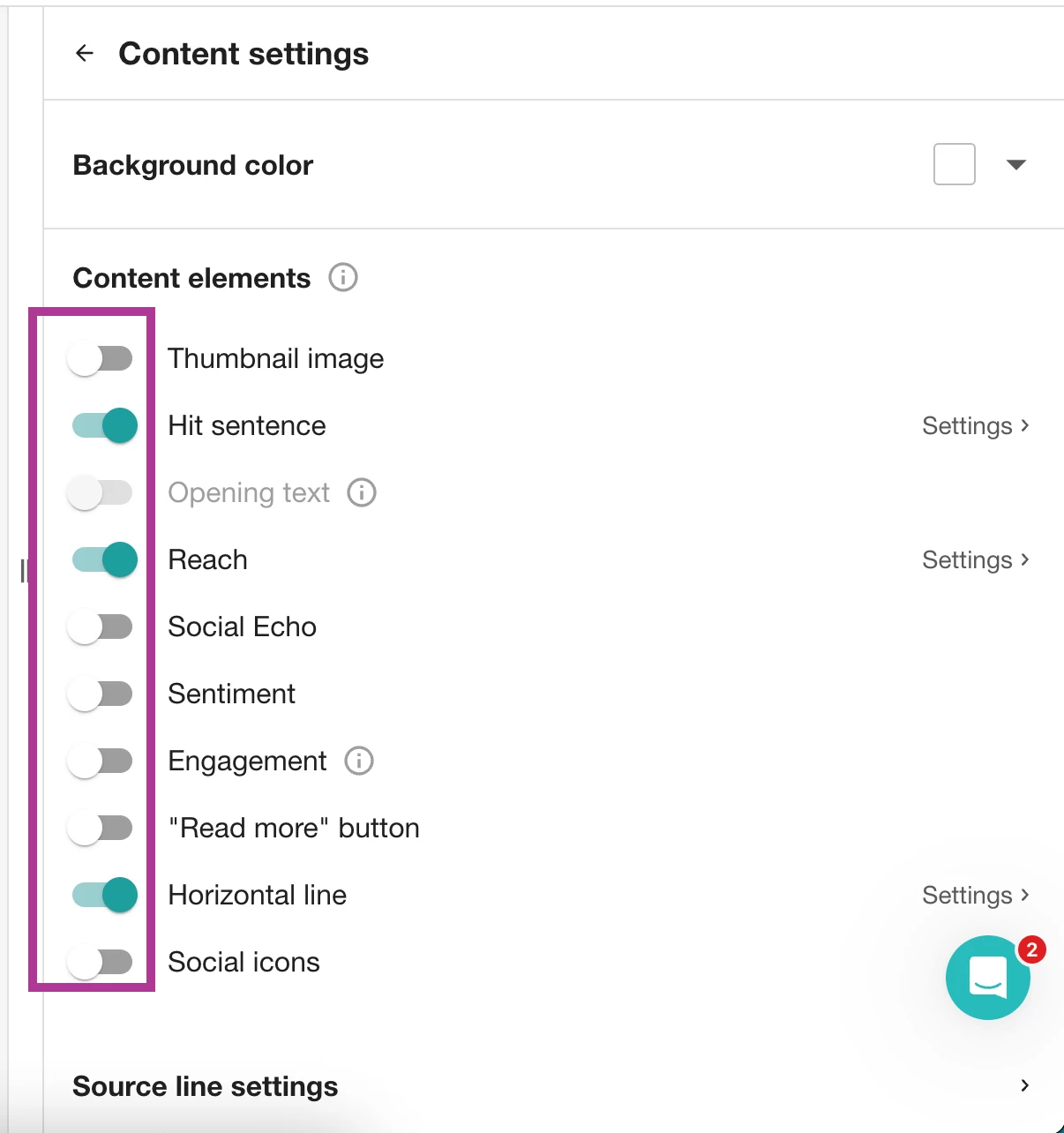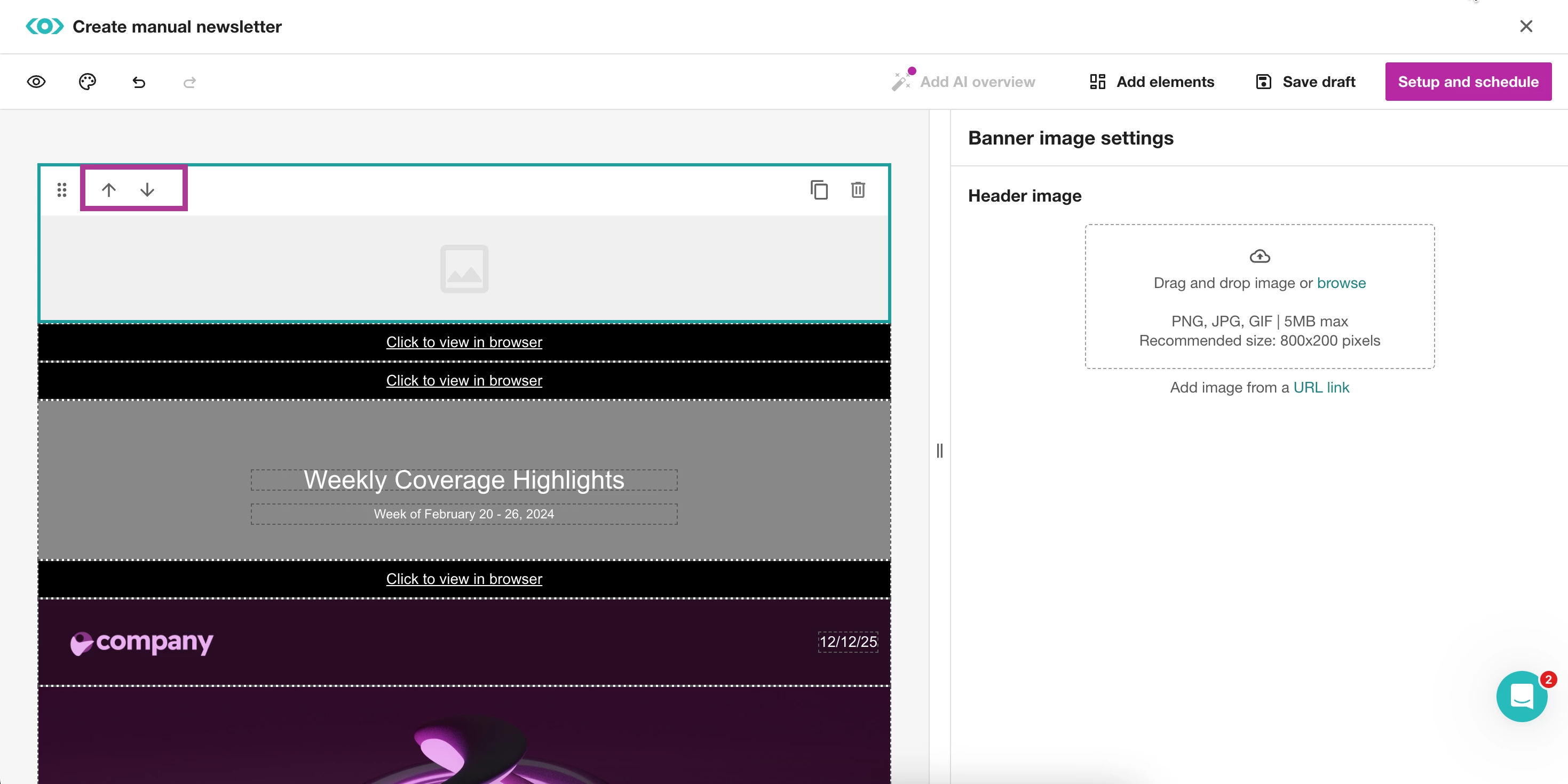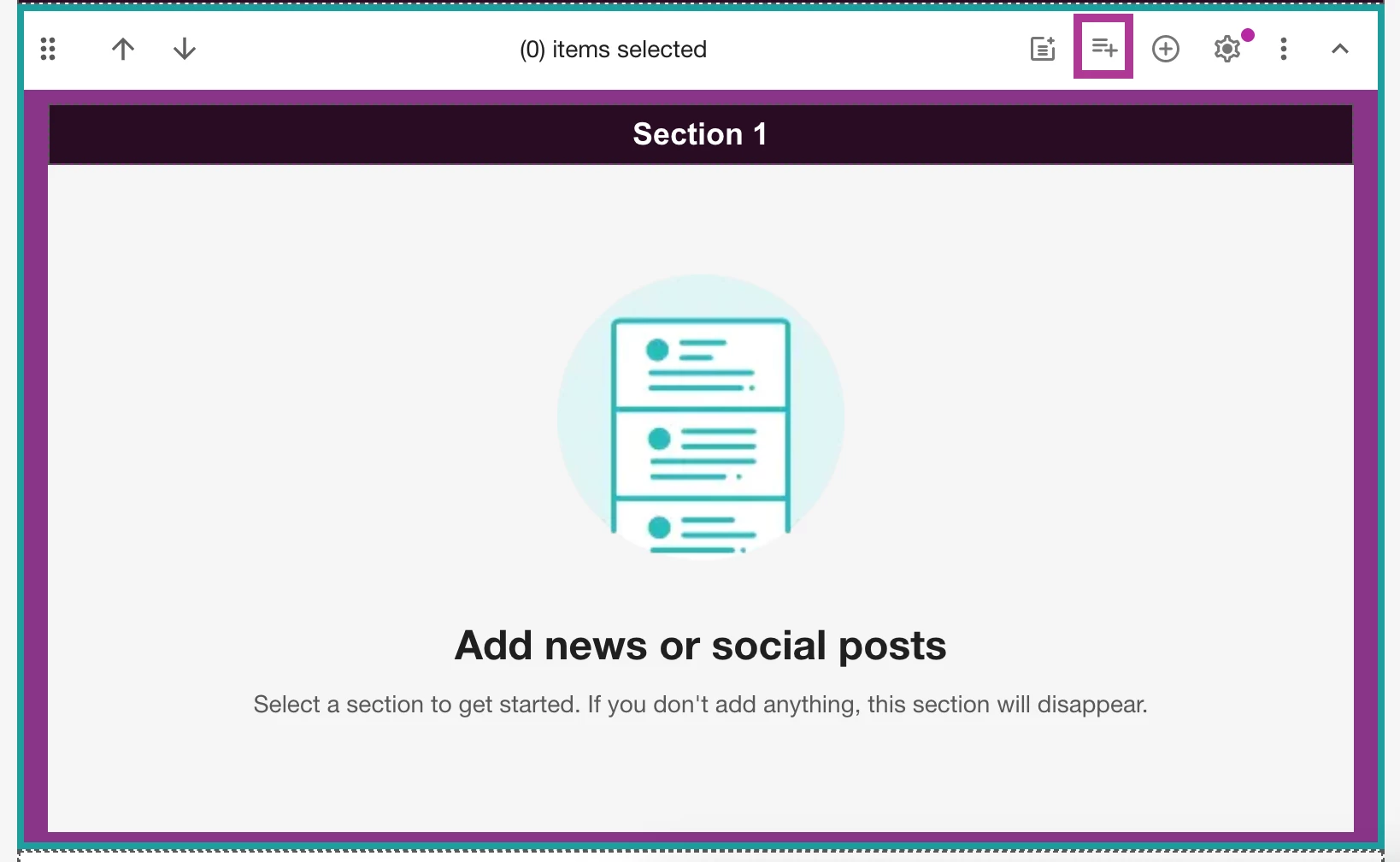 1. Click the + icon to the left of any mention to add it to your newsletter section. It will then immediately appear in the layout.
