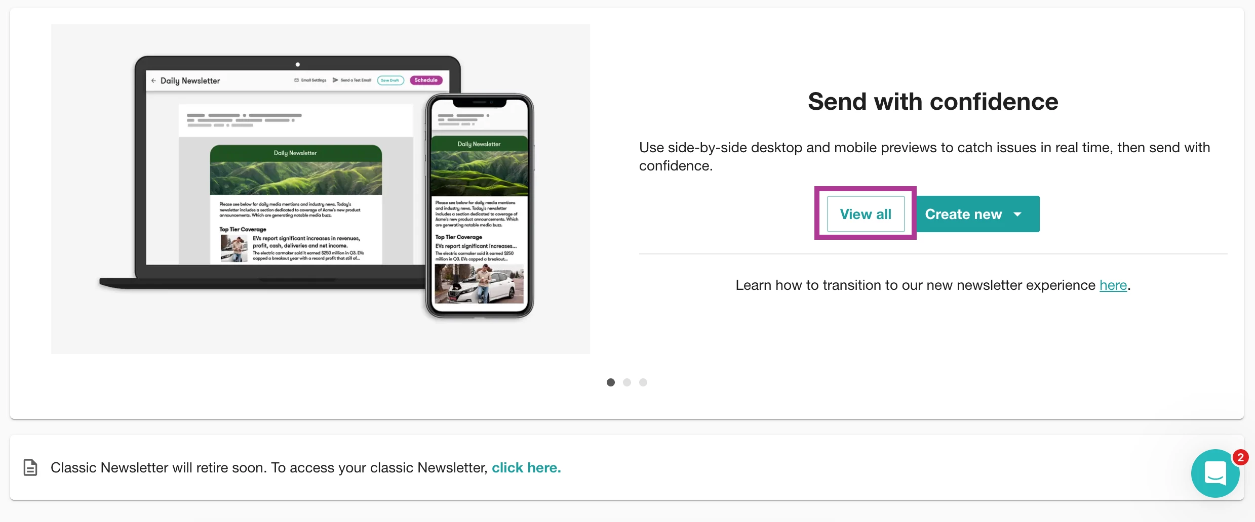 Today, you can find a button that allows you to toggle back to the Classic Newsletter. You can still continue using your Classic Newsletter, but we recommend you try out the new experience.