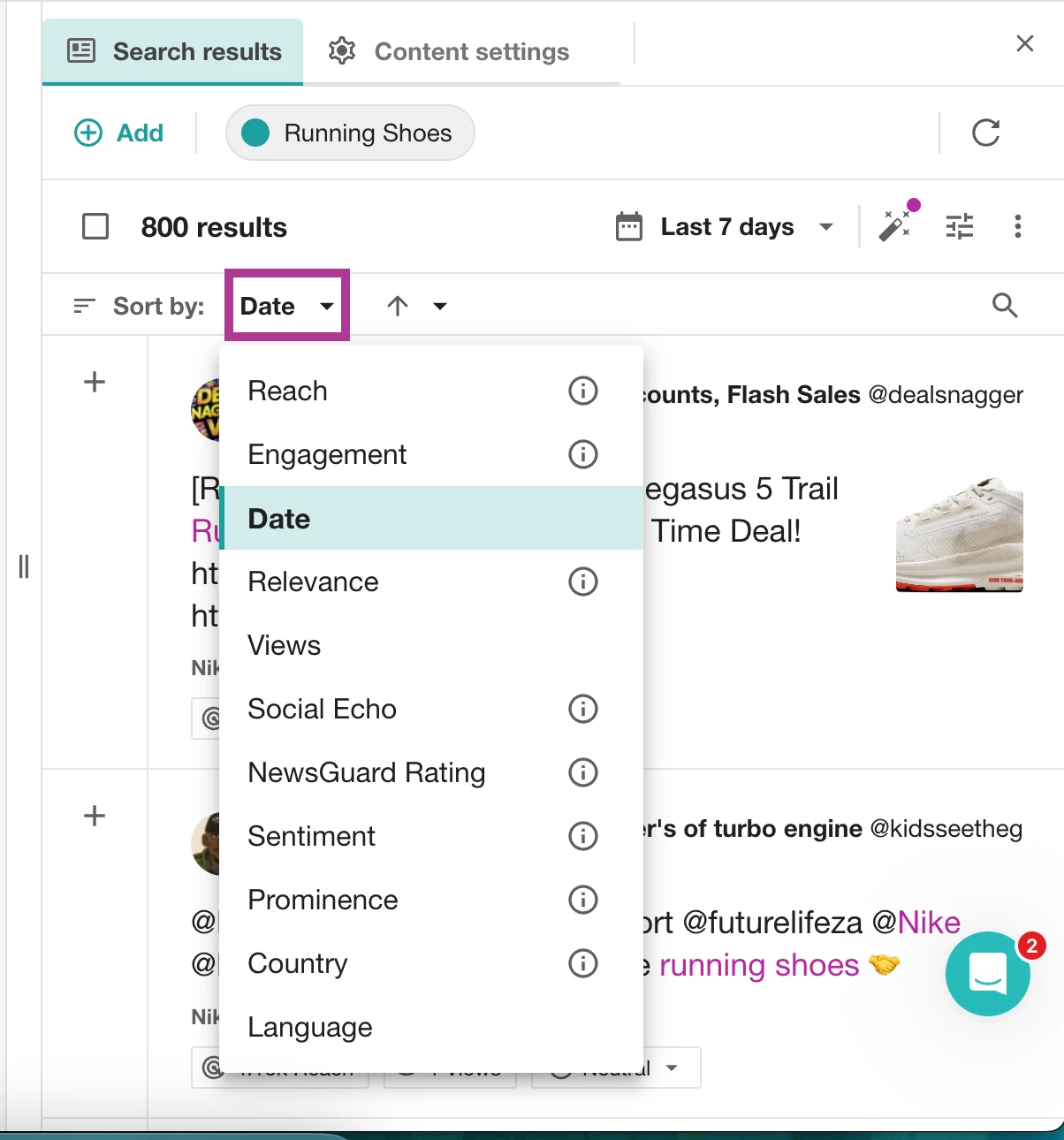 2. To reorder the stream before selecting content, select the Date drop-down to re-sort the content, such as by Reach or Social Echo