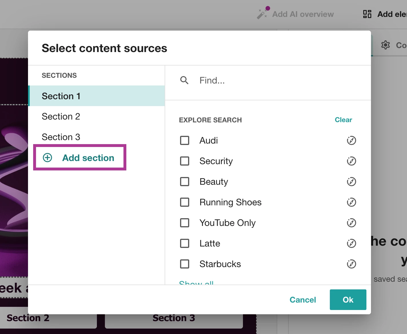 1. Select the checkboxes to the left of Explore Searches or Tags you want to add to each of the corresponding sections found on the left-hand side of the pop up