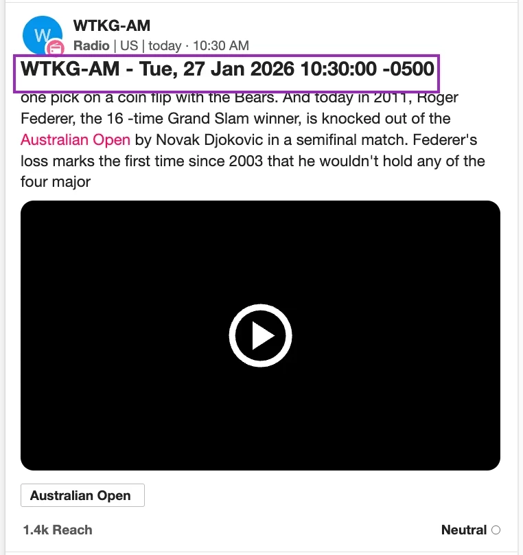 Por defecto, la mayoría de las menciones de transmisión se entregan en fragmentos de 10 minutos (por ejemplo, 9:40-9:50, 9:50-10:00). Sabrá que es un clip de 10 minutos cuando la mención tenga una marca de tiempo junto al nombre de la emisora: